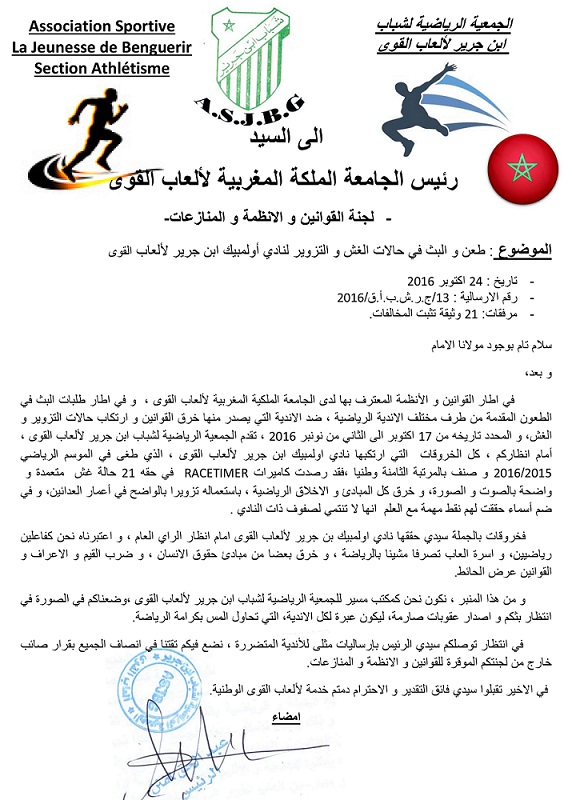 اتهمت مجموعة من الأندية المغربية المنضوية تحت لواء الجامعة الملكية لألعاب القوى و في طليعتها الجمعية الرياضية لشباب ابن جرير نادي أولمبيك ابن جرير الفوسفاطي بالغش و التزوير في الملتقيات الجهوية و الفدرالية بارتكاب 24 مخالفة برسم الموسم الرياضي المنصرم و التي يترتب عنها خصم النقط بشكل معياري الذي قد يفقد النادي رتبته و التوقيف عن الممارسة لسقف زمني معين من طرف لجنة الأنظمة و القوانين و المنازعات ، و حسب مصادر مقربة جيدة الاطلاع فإن حرب الإطاحة بالنادي من أبراجه المشيدة بعد جهد جهيد و عرق صبيب سببها الضربة القاسية التي تلقاها رئيس الجمعية الرياضية لشباب ابن جرير عبد الحق لمفنن بعدما خذله رئيس الأولمبيك الحجاج مساعد و نائبه عبد الإله دهشم بالتخلي عن دعمه و الوفاء بالالتزام و الوعد بمساندته كمرشح لرئاسة عصبة تانسيفت مراكش لألعاب القوى بحيث لم يكتف الرئيس و ذراعه الأيمن بالتخلف عن التصويت لفائدته بل قاد نائبه حملة مسعورة ضده بالواضح و على المكشوف و سجل هدفا خرافيا ” على الطاير ” في الأنفاس الأخيرة من الجمع العام الذي عرف مآزرة قوية لمرشح نادي الأشبال من طرف أندية و جمعيات الرحامنة التي كان بإمكانها احتكاما لمجموع أصواتها انتخاب رئيس للعصبة من الرحامنة و عبد الحق لمفنن يعلق على طريقة عمر المختار ” نحن لا نستسلم ، ننتصر أو نموت “.