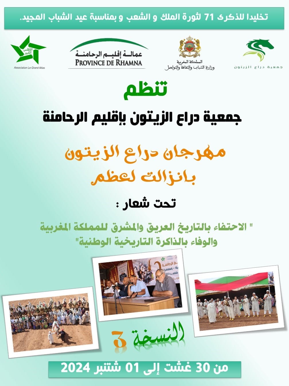بمناسبة الذكرى الواحدة والسبعين لثورة الملك والشعب وذكرى عيد الشباب المجيدة، وتحت شعار “الاحتفاء بالتاريخ العريق والمشرق للمملكة المغربية والوفاء بالذاكرة التاريخية الوطنية”، ستنظم جمعية دراع الزيتون بشراكة مع وزارة الشباب والثقافة والتواصل وجمعية الأطلس الكبير وبدعم من عمالة الرحامنة، وهيئات المجتمع المدني، الدورة الثالثة للمهرجان الوطني “دراع الزيتون” احتفاء بذكرى معركة سيدي بوعثمان التاريخية.