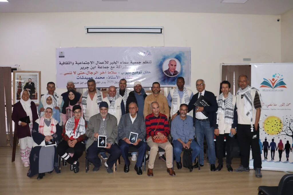 نظمت جمعية سماء الخير للأعمال الاجتماعية والثقافية، ابتداءً من الساعة الرابعة من بعد زوال أمس السبت 19 أبريل الجاري، بمكتبة دار الشباب “القدس” بابن جرير، حفل توقيع ديوان “سلاما آخر الرجال..حتى لا ننسى” للشاعر محمد حميدشات، وذلك بحضور العديد من المهتمين بالشعر والأدب بإقليم الرحامنة.