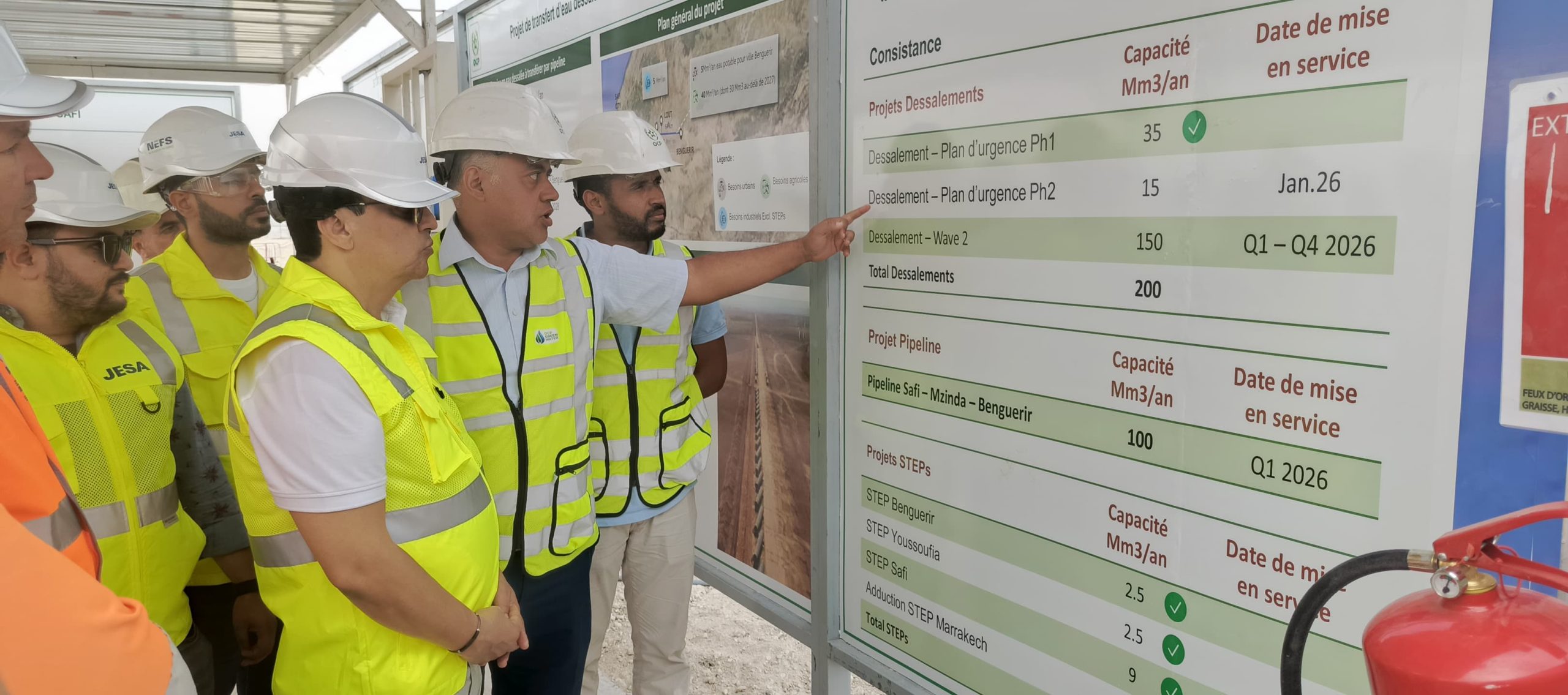 وفي إطار هذه الزيارة، قام السيد العامل أيضاً بزيارة ميدانية لأشغال خط الأنابيب [Pipeline] الذي يربط بين آسفي – مزيندة – ابن جرير بطاقة 100 مليون م³ سنوياً، حيث وقف على سير عمليات الحفر ووضع الأنابيب ومختلف المراحل التقنية المرتبطة بهذا المشروع الحيوي، مبرزاً الأهمية الكبرى لهذا الخط في تأمين حاجيات الإقليم من الموارد المائية ودعم التنمية الفلاحية والصناعية.