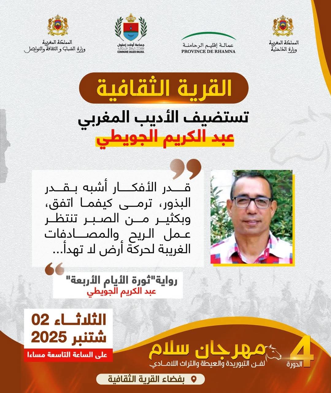 في إطار فعاليات مهرجان سلام في دورته الرابعة، الذي يحتفي بفنون التبوريدة والعيطة والتراث اللامادي، تستضيف القرية الثقافية الكاتب المغربي المرموق عبد الكريم الجويطي، صاحب الرواية الشهيرة “ثورة الأيام الأربعة”، وذلك يوم الثلاثاء 2 شتنبر 2025 على الساعة التاسعة مساءً بفضاء القرية الثقافية.