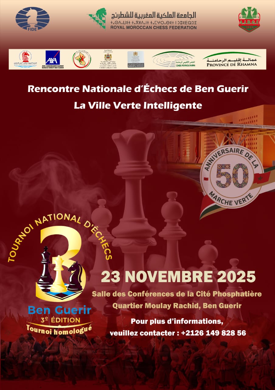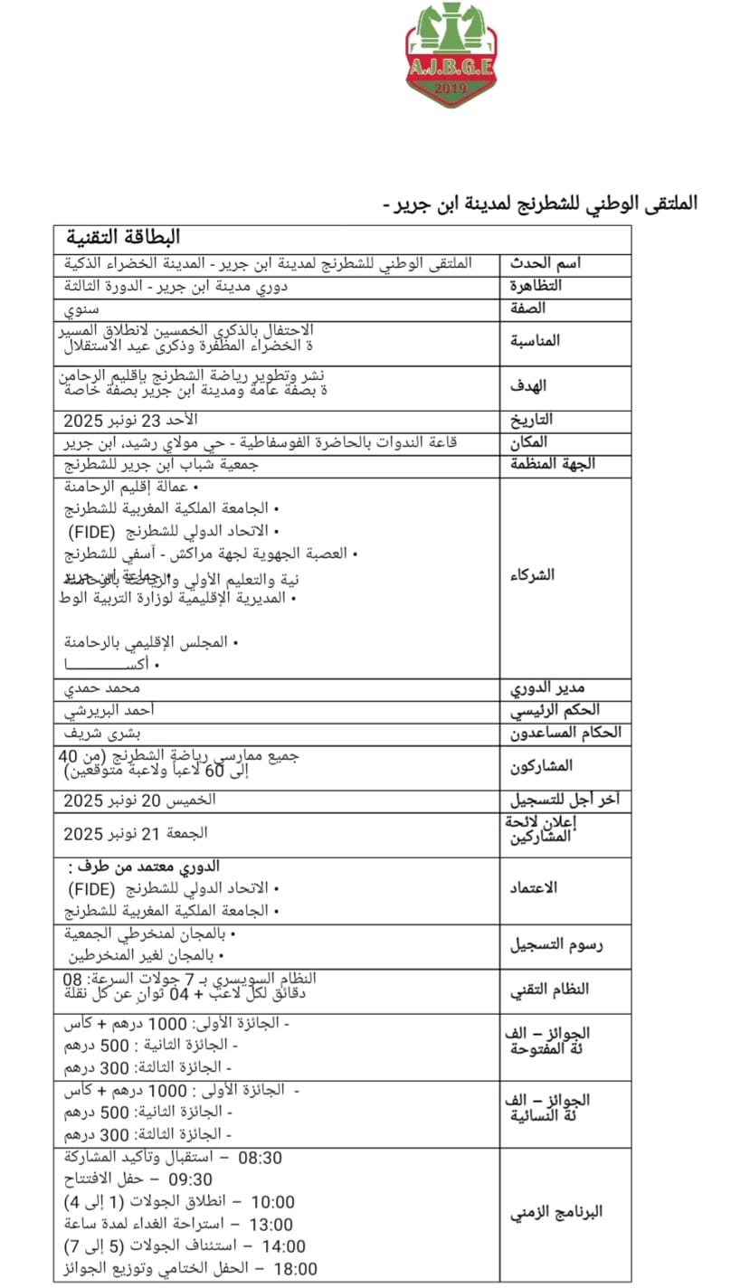 احتفاءً بالذكرى الخمسين للمسيرة الخضراء المظفرة، وعيد الوحدة، وعيد الاستقلال المجيد، تنظم جمعية شباب ابن جرير للشطرنج، تحت إشراف عمالة إقليم الرحامنة والجامعة الملكية المغربية للشطرنج والعصبة الجهوية مراكش آسفي للشطرنج، وبدعم من الجماعة الترابية لابن جرير، الدورة الثالثة لدوري مدينة ابن جرير للشطرنج، وذلك يوم الأحد 23 نونبر 2025، بقاعة الندوات بحي مولاي رشيد بمدينة ابن جرير.