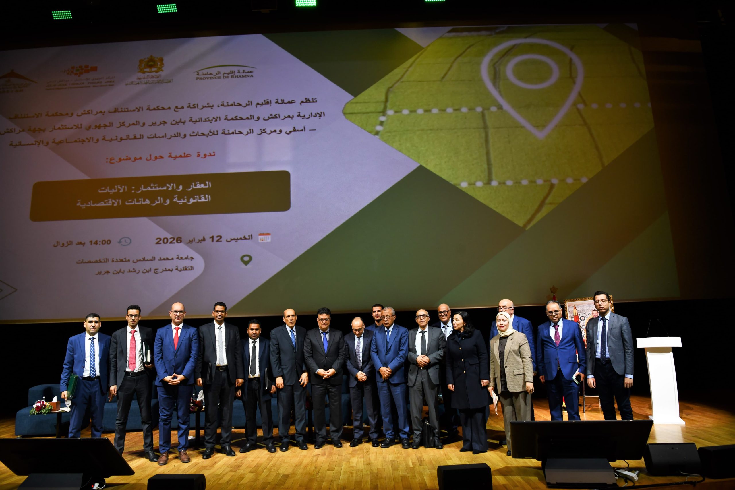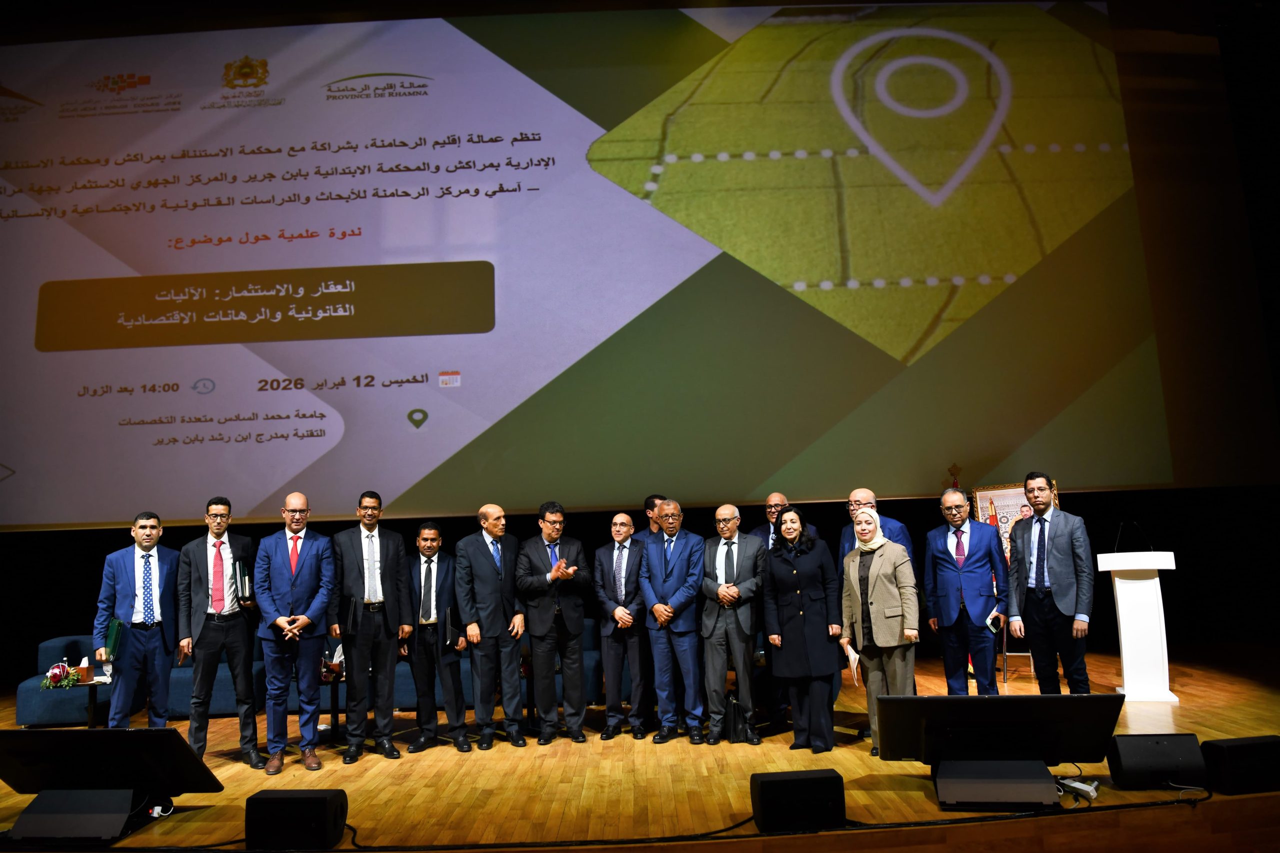 نظمت عمالة إقليم الرحامنة، يوم الخميس 12 فبراير 2026، بمدرج ابن رشد بجامعة محمد السادس متعددة التخصصات التقنية بابن جرير، ندوة علمية حول موضوع “العقار والاستثمار: الآليات القانونية والرهانات الاقتصادية”، وذلك بشراكة مع محكمة الاستئناف بمراكش، ومحكمة الاستئناف الإدارية بمراكش، والمحكمة الابتدائية بابن جرير، والمركز الجهوي للاستثمار لجهة مراكش–آسفي، ومركز الرحامنة للأبحاث والدراسات القانونية والاجتماعية والإنسانية. وقد عرفت هذه المحطة العلمية حضورًا وازنًا فاق 200 مشاركة ومشارك، من مسؤولين قضائيين وإداريين، ومنتخبين، وأساتذة جامعيين، وخبراء، إلى جانب فاعلين اقتصاديين ومستثمرين.
