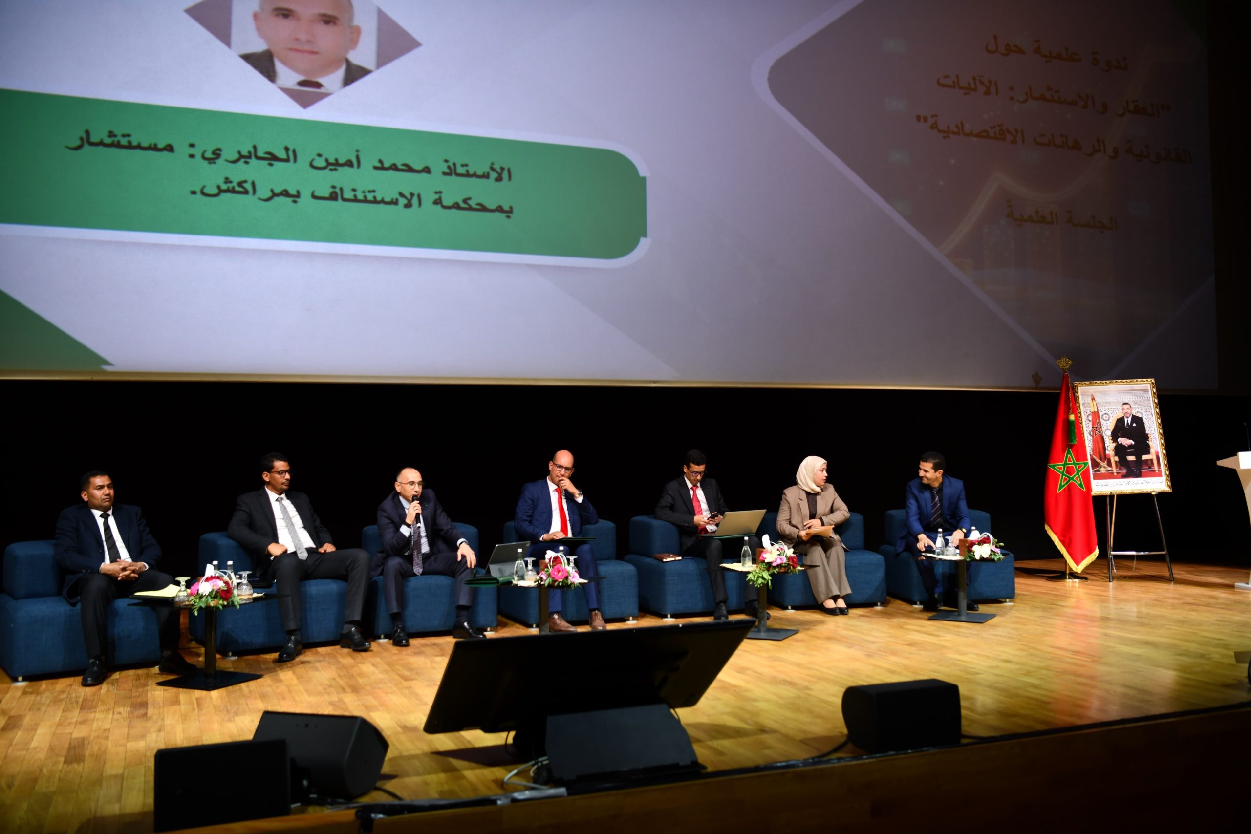 وعلى المستوى العلمي، تناول الأستاذ محمد أمين الجابري، مستشار بمحكمة الاستئناف بمراكش، موضوع القيود الاتفاقية الواردة على حق الملكية العقارية، مميزًا بينها وبين القيود القانونية، ومبرزًا دور القضاء في مراقبة مشروعيتها حتى لا تتحول إلى عائق أمام تداول الأموال أو كابح للاستثمار، مستندًا إلى نماذج من الاجتهاد القضائي. ومن جهته، أكد الأستاذ محفوظ مساعد، المدير العام للمركز الجهوي للاستثمار لجهة مراكش–آسفي، أن جاذبية المجال الترابي ترتبط بتكامل عدة عناصر، في مقدمتها توفر العقار الجاهز، وجودة البنية التحتية، ونجاعة الخدمات، ورقمنة المساطر، مشددًا على ضرورة توجيه الأوعية العقارية نحو مشاريع منتجة ومحاربة المضاربة.